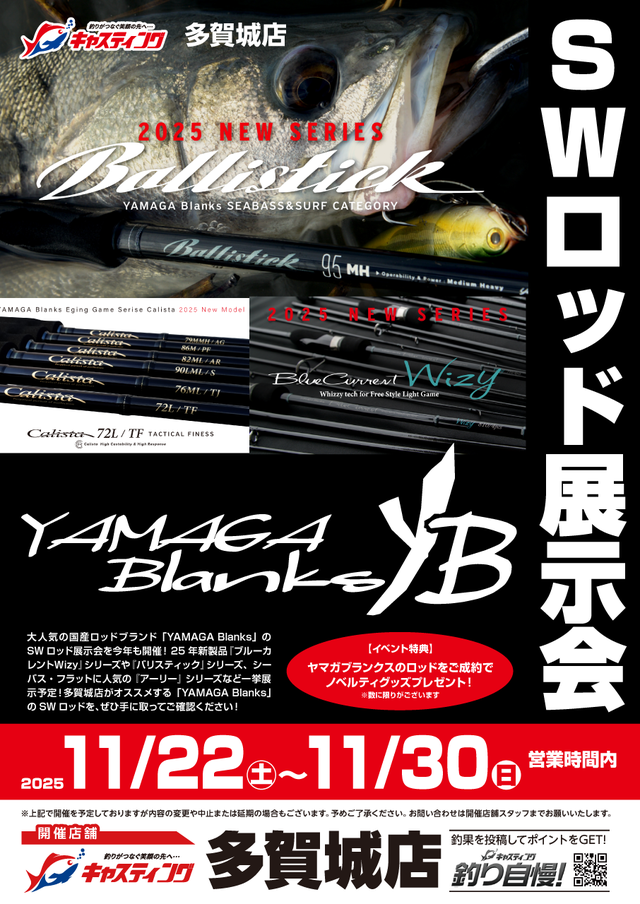 25年新製品『ブルーカレントWizy』シリーズや『バリスティック』シリーズ、シーバス・フラットに人気の『アーリー』シリーズなど一挙展示予定!多賀城店がオススメする「YAMAGA Blanks」のSWロッドを、ぜひ手に取ってご確認ください!
