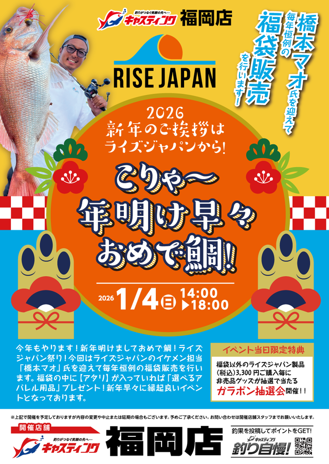 今年もやります!新年明けましておめで鯛!ライズジャパン祭り!今回はライズジャパンのイケメン担当「橋本マオ」氏を迎えて毎年恒例の福袋販売を行います。福袋の中に【アタリ】が入っていれば「選べるアパレル用品」プレゼント!新年早々に縁起良いイベントとなっております。