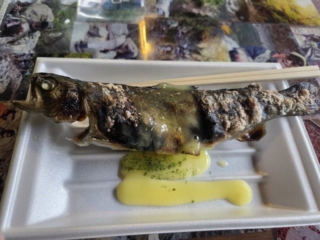 コチラの釣り場さんでは釣った魚を有料で塩焼きにしてもらえるので、1匹焼いてもらいました♪