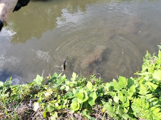 先ずはスピナーベイトで様子を見てみよう。濁りはありますが水深が浅いため魚影は薄っすら見えます。