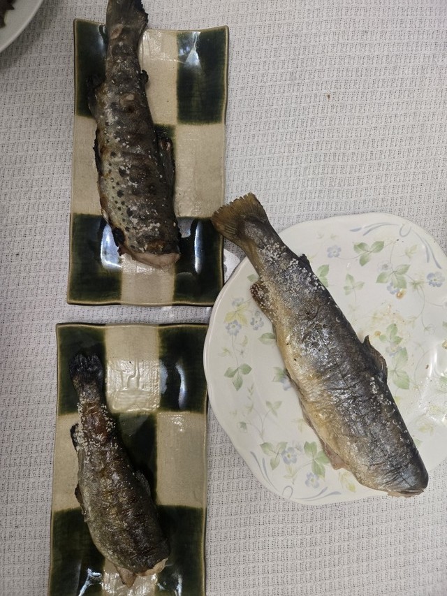 晩御飯はヤマメ、ニジマス、頂いたイワナの塩焼き食べ比べ!