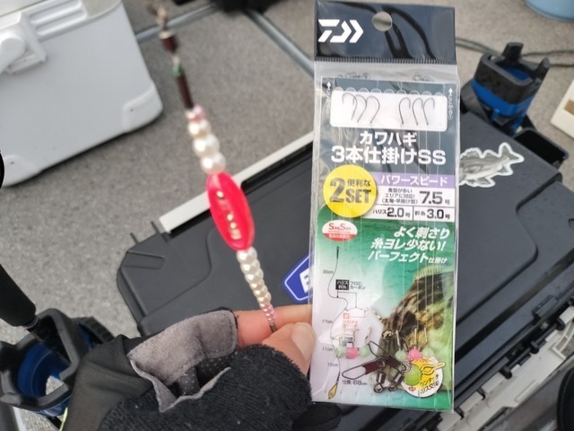 ゴージャス感を好むカワハギにはパールビーズをあしらったラトル集寄を使用してみました。ラトルボール付きでサウンドでもアピールしていきます。水深は約30m。ホログラム付きの30号の錘を最初は使っていましたが途中から35号に変更しました。