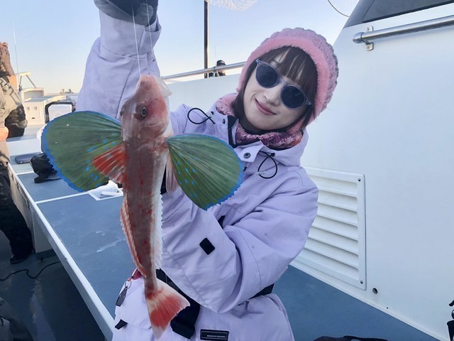 お隣のまゆちゃんがナイスサイズのホウボウキャッチ♪
