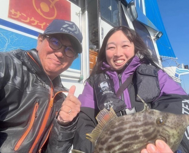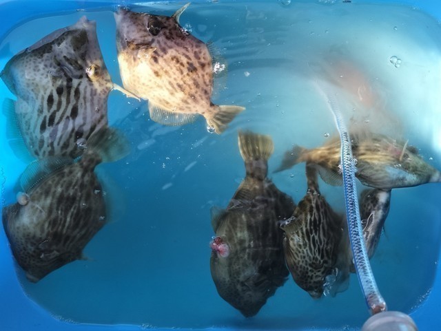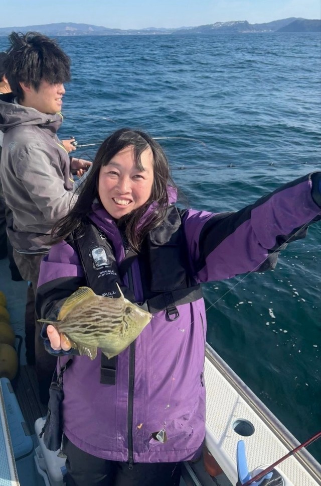 しばらくして左舷側でもミヨシやトモで釣れてきて、両隣の釣り友達もカワハギをゲット('ω')