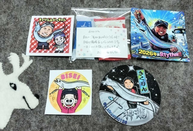 受付をして、きくりんさんの左右の手のどちらかを選んで、参加賞のテンヤをいただき釣り座の抽選* (*'▽')