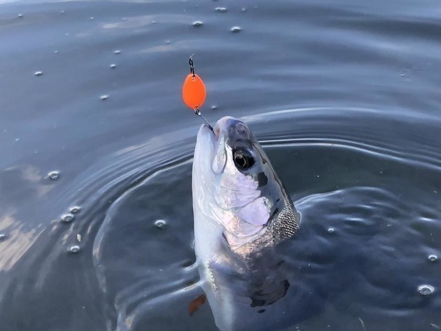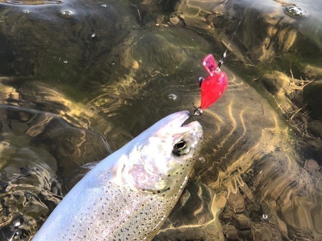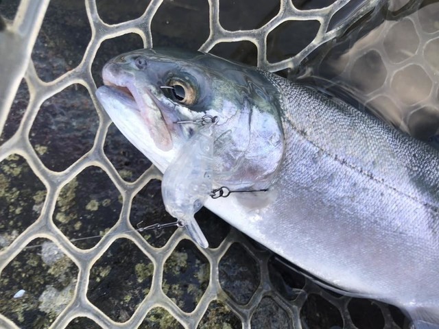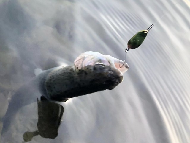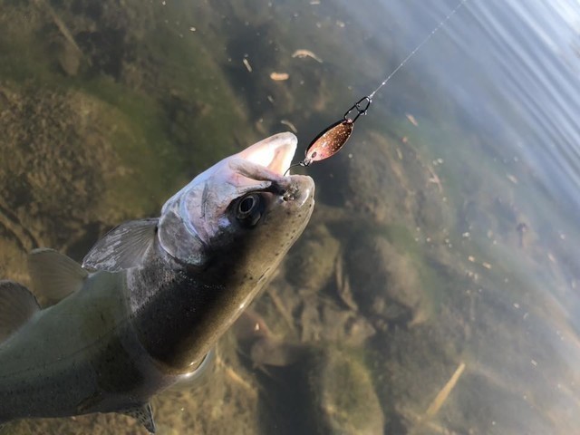 9時前だったのでちょっと放流早いなぁと思いつつ、波動系のスプーンにチェンジして表層を狙う放流狩りにシフトチェンジします