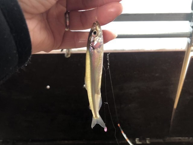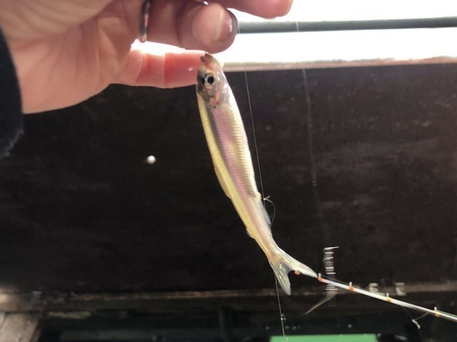 やっと掛けたワカサギは当歳魚のようで小さめでした