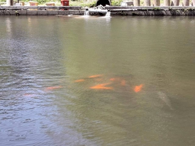 オレンジ鯉は池の真ん中にいるので、長めの竿が必要かも…
