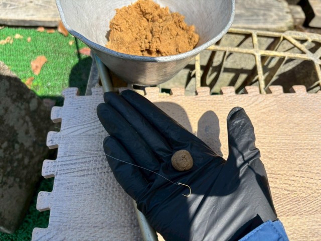 針が隠れるくらい(ビー玉サイズくらい)にエサをまるめて付けます。