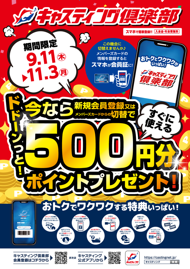 キャスティング倶楽部(オンライン会員)に「新規ご登録」又は「メンバーズカードからの新規切替え」で、通常ポイント100ポイント+さらに400ポイントの【合計500ポイント】をプレゼント!(登録時に自動で付与されます)