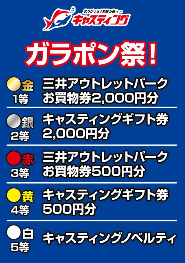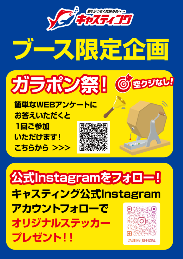 イベントブースでは、三井アウトレットパークで使えるお買物券やキャスティング各店舗で使えるキャスティングギフト券などが当たる【ガラガラ抽選会】と、お子様向けの無料イベント【おかし釣り】や【おもしろけしごむガチャ】を開催!