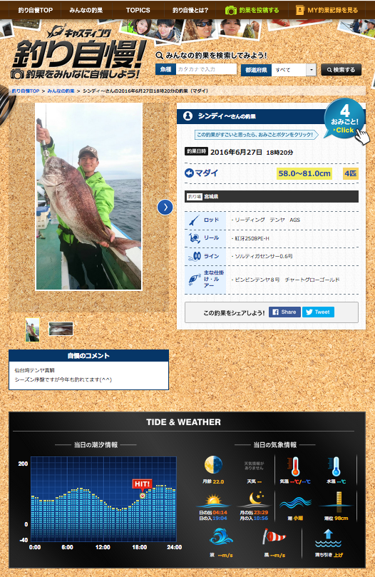 「釣り自慢」のみんなの釣果から「全国の潮汐や天気、釣れ時情報」をチェックしてみよう!!