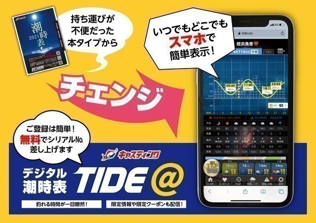 デジタル潮時表【TIDE@(タイドアット)】限定店舗にて無料でシリアルNo.差し上げてます!