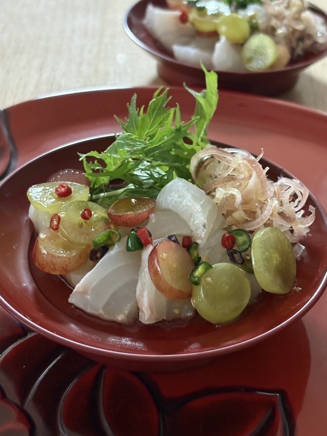 ヒラスズキのピリ辛カルパッチョ~ぶどうの甘みとともに~