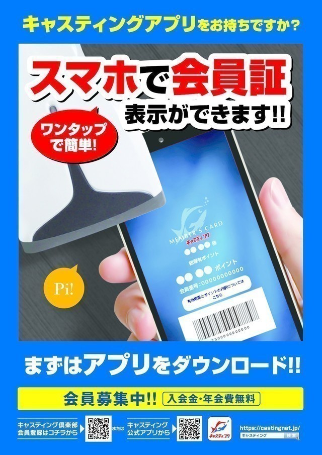 キャスティングアプリから会員登録すると、お持ちのスマホが会員証になってとても便利!!
