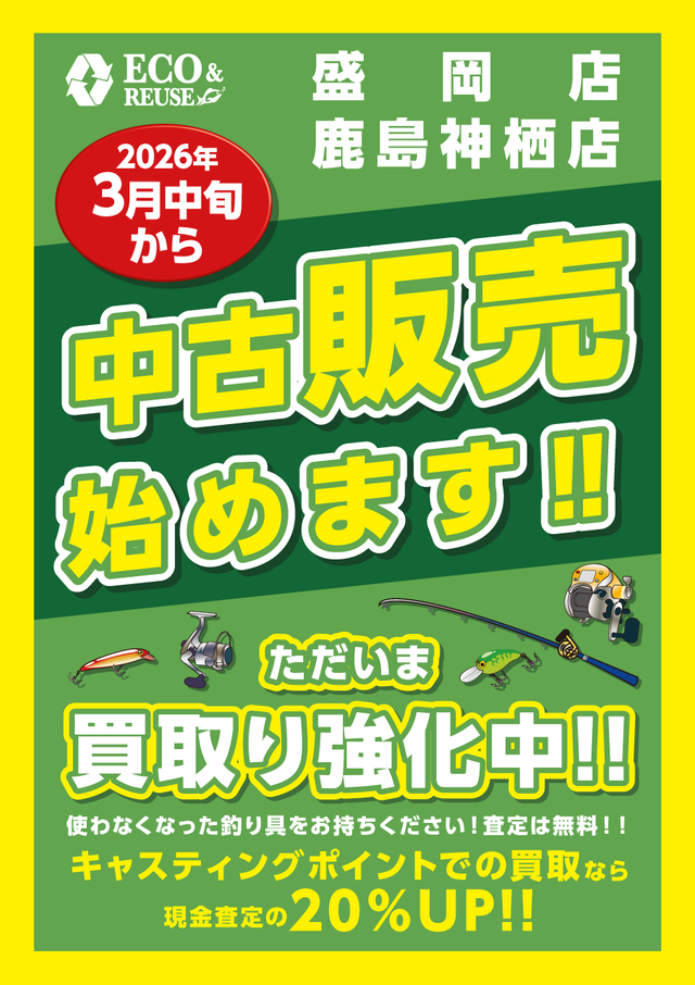 2026年3月中旬から、盛岡店・鹿島神栖店にて【中古販売】始めます!!