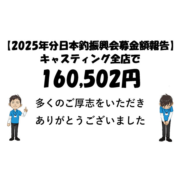 キャスティング全店に設置しております日本釣振興会の募金箱へ2025年分として160,502円の募金が集まり、日本釣振興会に送金させていただきました。