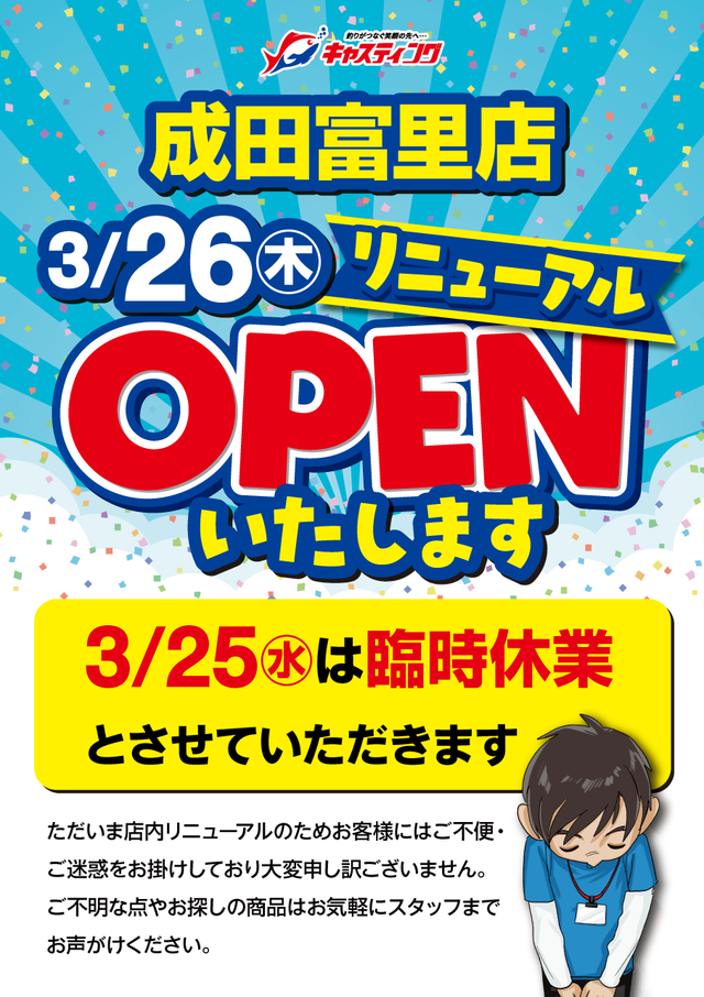 3/25(水)【成田富里店】店内改装に伴う「臨時休…