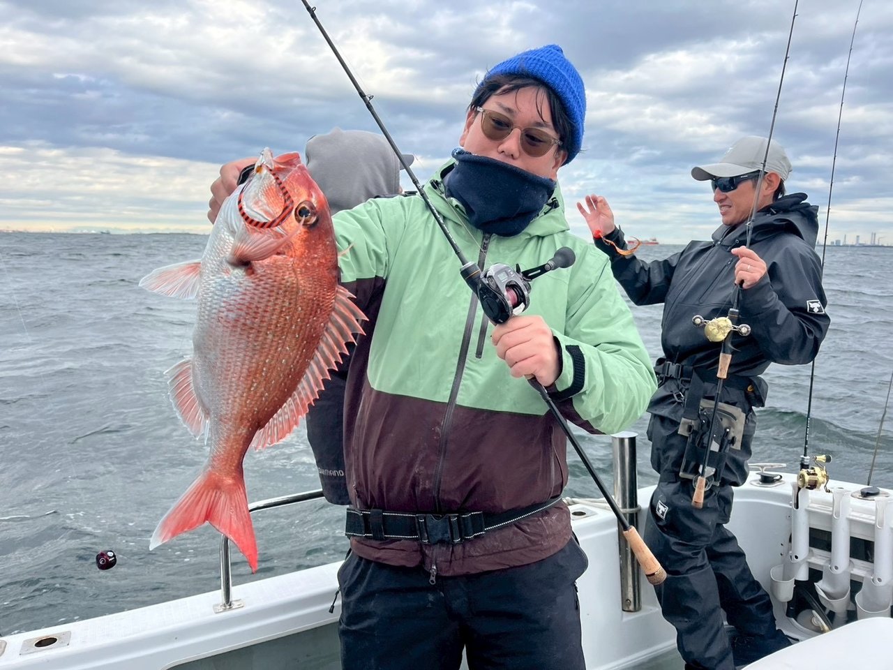 この日はどれも1キロ前後くらいのサイズばかりで、田邊さんのマダイが上がった時はさすがプロだ、と中山くんと騒いでおりました。笑