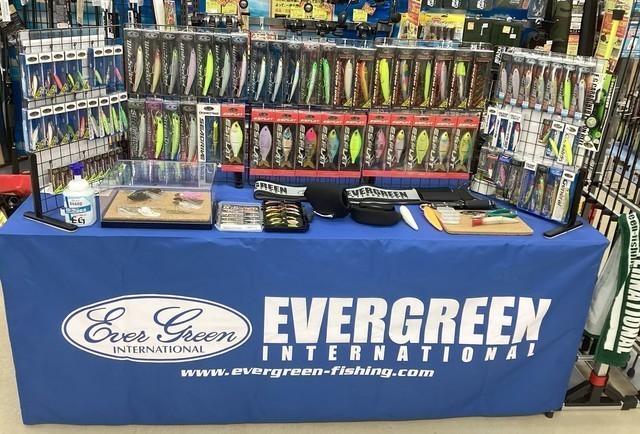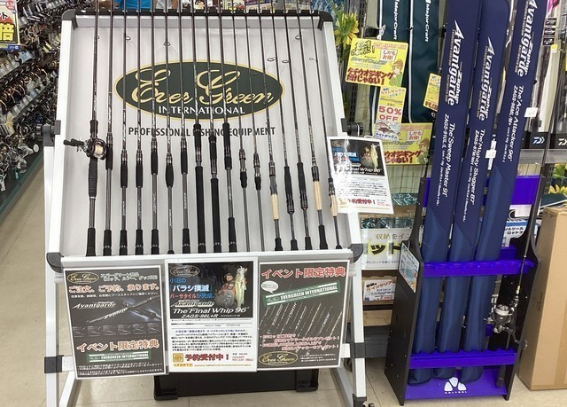 EGバスプロスタッフ星野和正氏も来店し、新製品バスロッド等も展示。