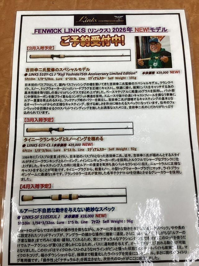 ティムコ フェンウィック リンクス2026年新製品 ご予約受付中です♪吉田幸二氏の75歳スペシャルロッドもご予約できます。