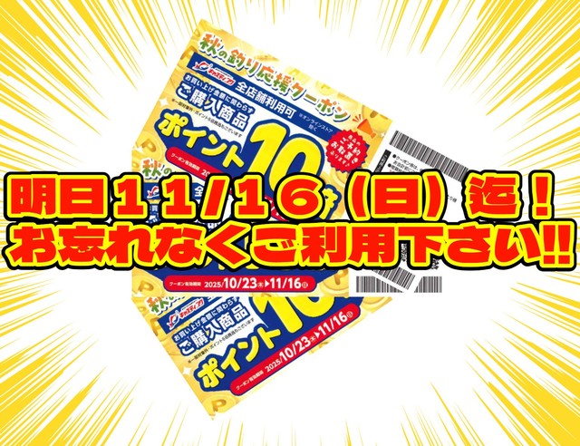 キャスティング泉バイパス店にて、10/1(水)~10/22(水)の期間中、お買物いただいたお客様全員にレジにてプレゼントしていた『ポイント10倍券』のご利用もいよいよ明日11/16(日)迄となりました!!使い忘れはありませんか?最後迄お忘れないようご利用下さい♪