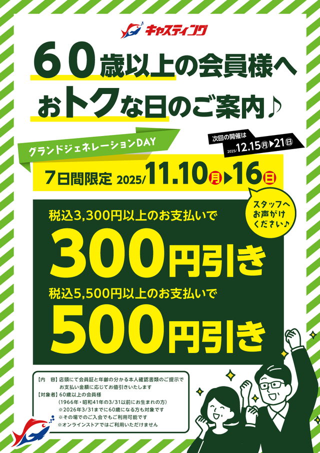 60歳以上の会員様、店舗スタッフへお声がけください!!