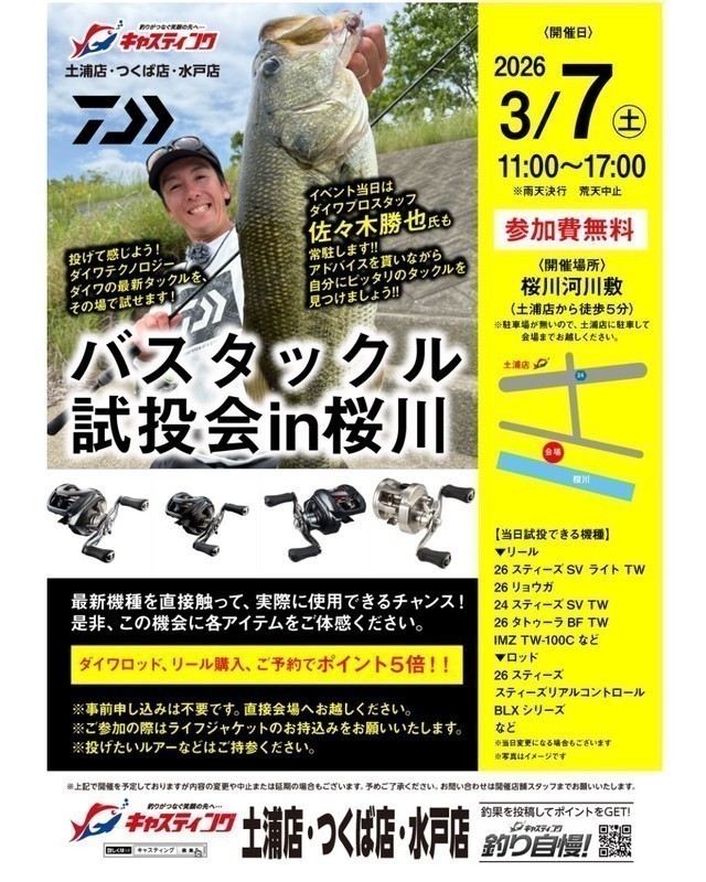 3/7(土)3店舗合同ダイワバス最新タックル試投&受注会in桜川 開催致します!