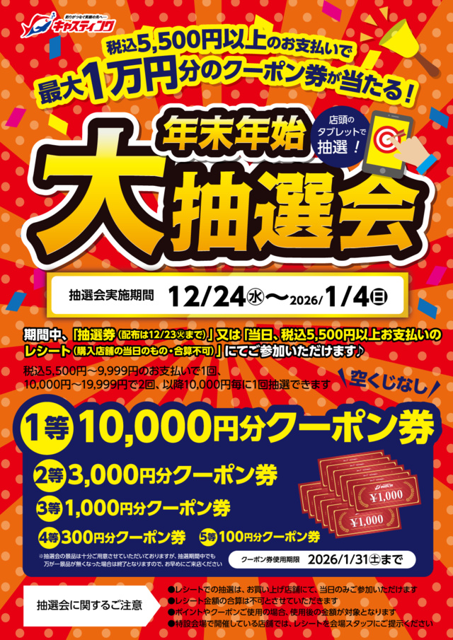 11/27より抽選券プレゼント♪12/24~1/4、最大1万円分のクーポン券がその場で当たる【年末年始大抽選会】