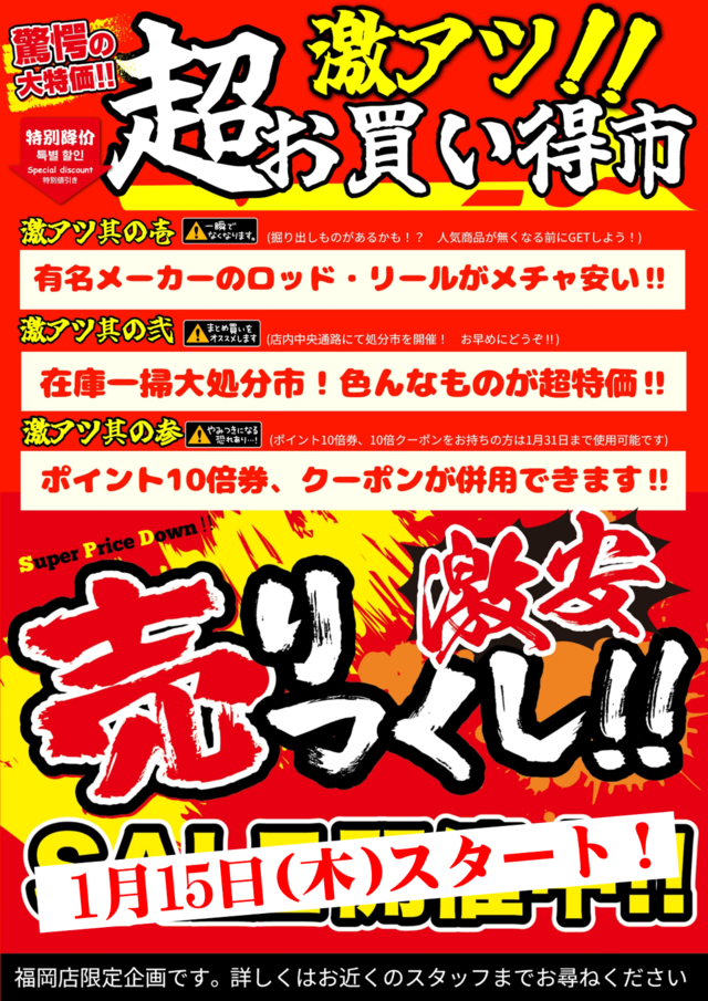 いよいよ明日1/15(木)~2/15(日)年に一度の【決算セール】開催!!