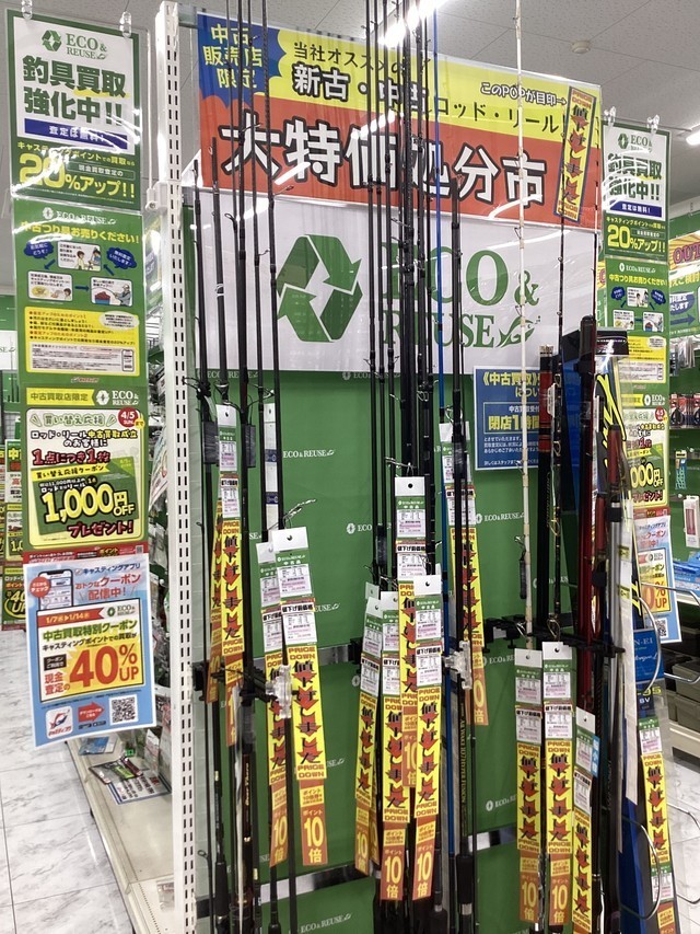 さらに♪ロッド・リール中古買取成立のお客様に買取一点につき一枚「ロッド又はリール1点レジにて1000円引き」クーポンをお渡しいたします!