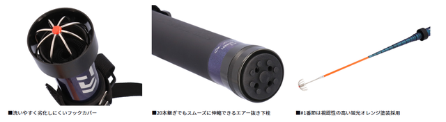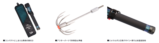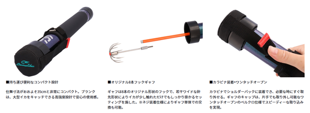 仕舞寸法が約35cmと、コンパクト設計を実現し携帯性を向上。さらにギャフのキャップは、片手でも取り外し可能なワンタッチオープンのベルクロ仕様で、記録級のアオリイカもスピーディーな取り込みを可能にする。