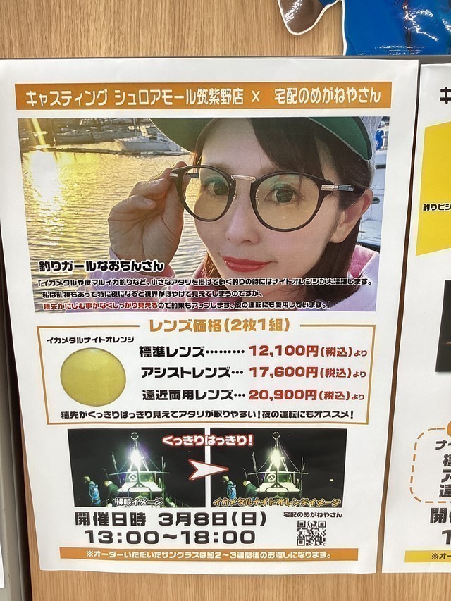 受注会では各種偏光レンズ、また、真っ暗闇の夜釣り用レンズ「ナイトオレンジ」をお選びいただけます。