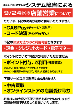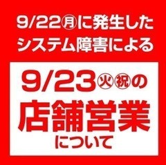 (9/29更新)9/22(月)に発生しましたシステム障害に伴う店舗営業について