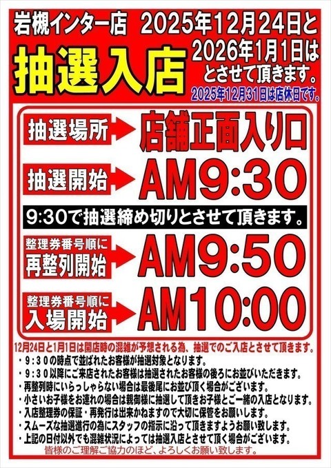 岩槻インター店「2026年1月1日」の福袋販売に伴う抽選入店のご案内