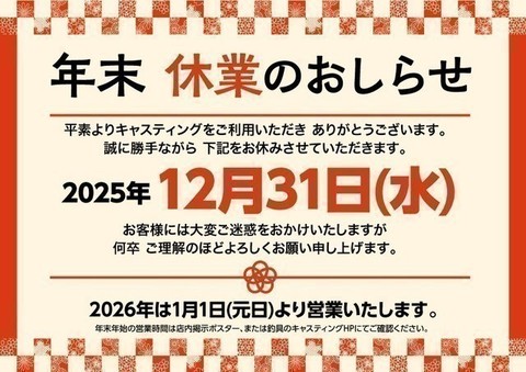 本年もキャスティング多賀城店をご利用いただきまして誠にありがとうございました。