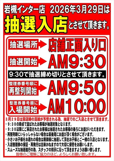 明日29日(日)の開店時入店方法についてのご案内