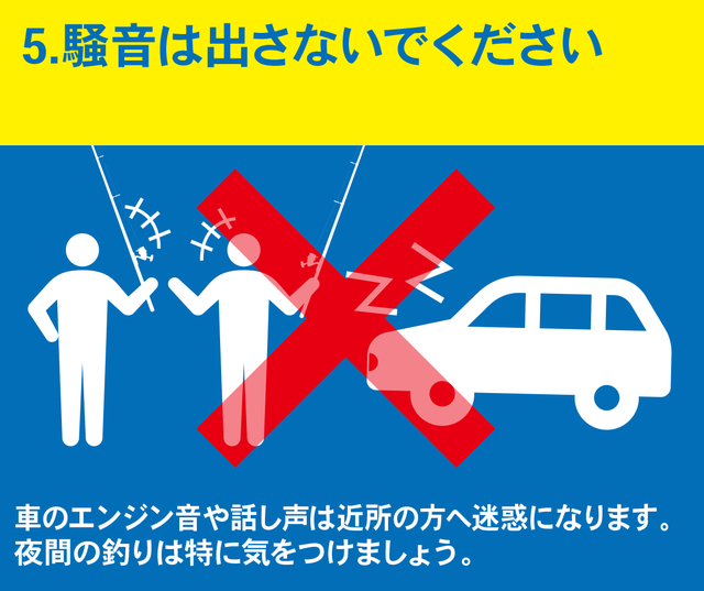 車のエンジン音や話し声は近所の方へ迷惑になります。夜間の釣りは特に気をつけましょう。