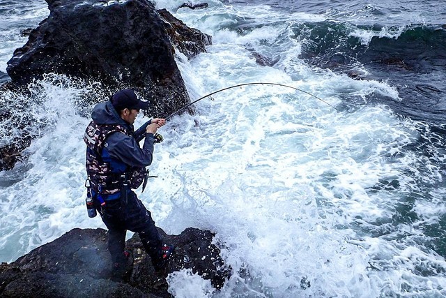 サフェコンを遠投して、沖めの岩盤の真上をゆっくり通すと、ズドン!