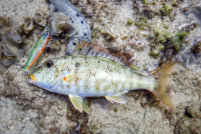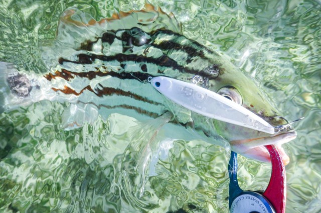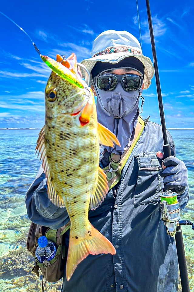 おおかたの予想通りリーフの魚たちに猛攻撃を受け、無事、1軍昇格の手ごたえを得ました。気になるリーフフィッシングタックルとの相性は?まあストレスなく投げられ、魚が釣れるアクションも出てるからOKでしょ!というところ。リーフエッジ付近で、118に良いサイズのカスミアジがヒットしましたが強烈に走られラインブレイク(涙)