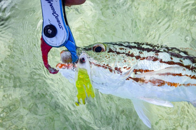 リーフの釣りは気軽で楽しいけど、不意の一発大物の可能性もあります。いたずらにライトな細仕掛けは命取り。私は最低でもPE2号を基準にしてます。インリーフでも入り組んだサンゴだらけなので、リーダーはフロロの6~8号が標準。サーフェイスコントローラー80は自重8g、理由もなくPE2号のタックルでサフェコン80を使う人は先ずいないでしょうが、このタックルでも、実釣レベルでは十分に使えて戦力になることが発見出来ました。