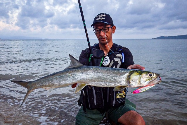 5~10センチくらいのベイトがピチャピチャ追われてます。すかさずサフェコン118をキャストし、早巻き&トゥイッチで誘ってくるとドーンとヒット!ジャンプしまくる好ファイタでした~。